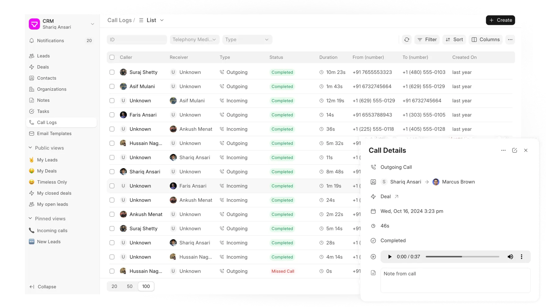 Jotting down notes on sticky pads or personal notebooks means important details don’t reach the team. Mjara CRM automatically tracks calls via Exotel and Twilio integrations, creating a permanent conversation record. You can also manually log calls to ensure nothing gets missed.