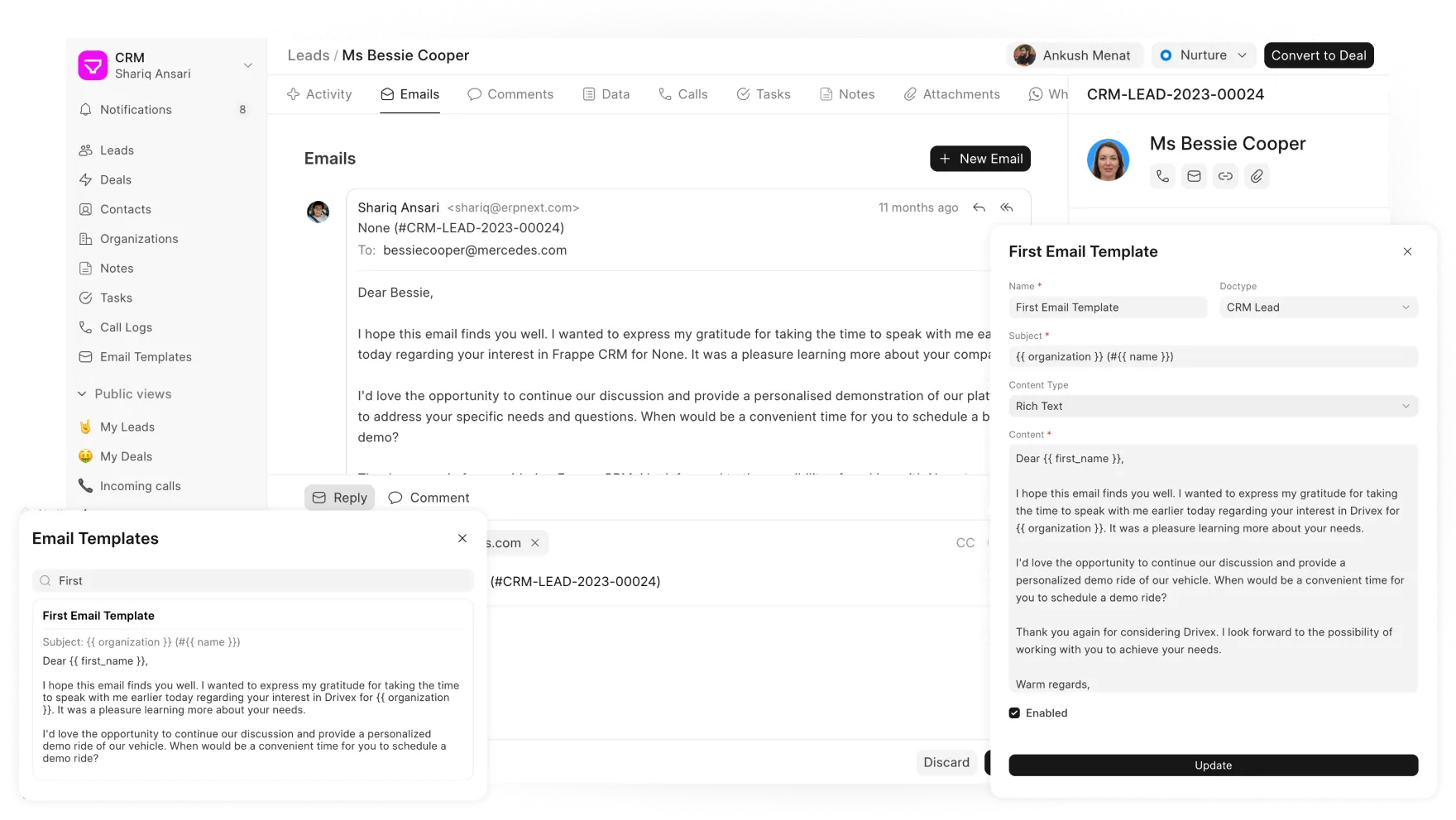 Mjara CRM keeps every email linked to the right lead or deal, so you never lose context. Save common responses as templates to respond efficiently while keeping communications personalized.