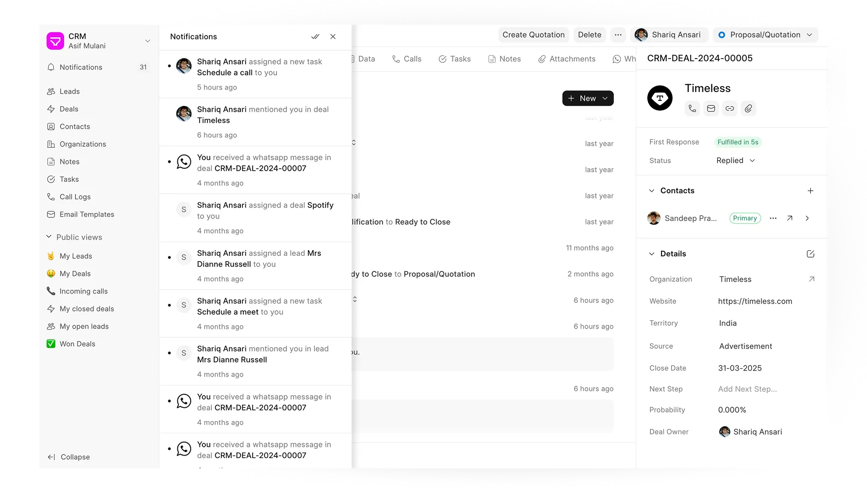 No need to constantly check your CRM for updates. Mjara CRM sends timely alerts when leads are assigned, deals progress, or teammates need your input. You'll know exactly when to take action, letting you concentrate on what matters – building relationships and closing deals.