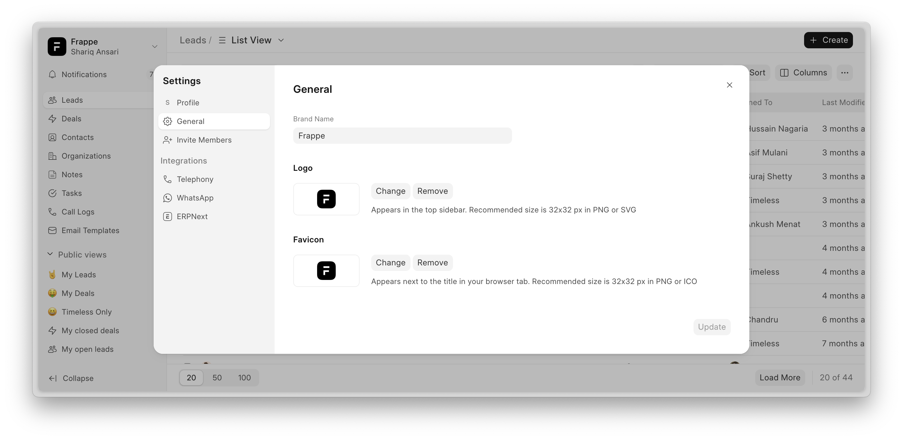 You can now customize your Mjara CRM with a custom Logo, Name, and Favicon based on your business requirements. This feature is accessible under Settings → General.