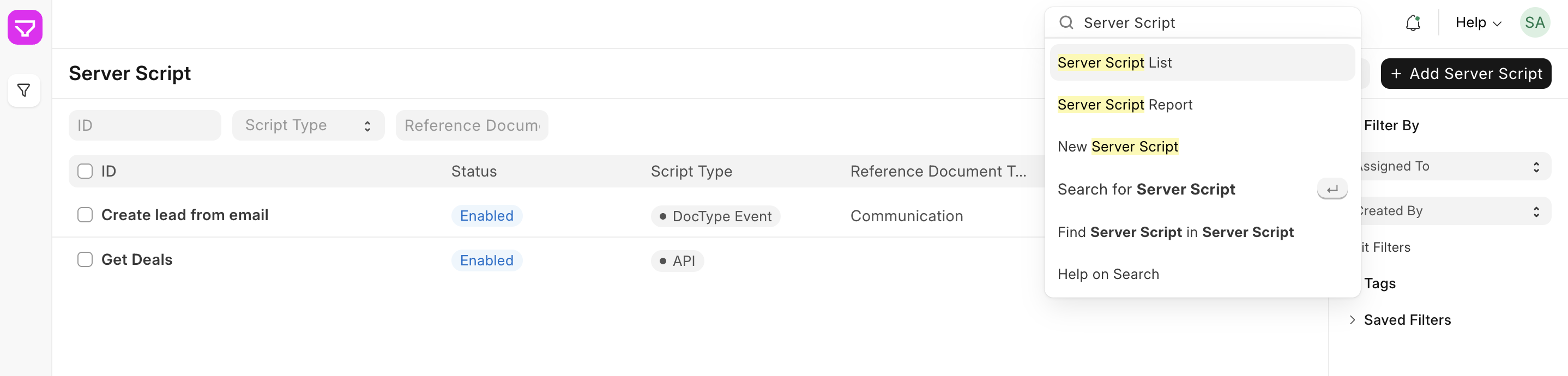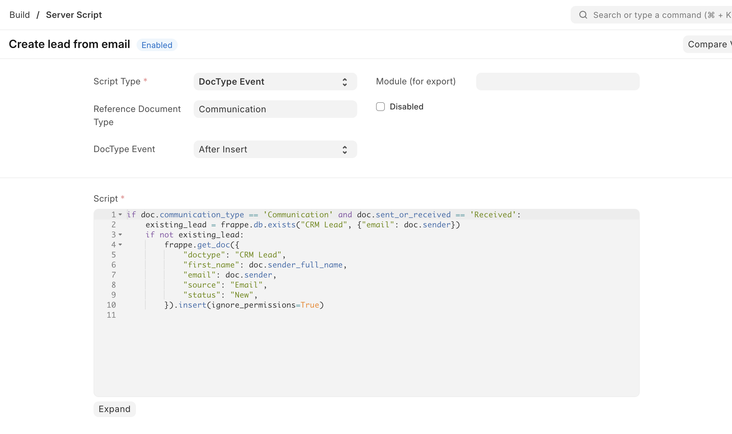 In Mjara CRM, you can automate lead creation using the Server Script feature. The Server Script DocType allows you to write server-side Python code without creating a custom app or deploying anything.