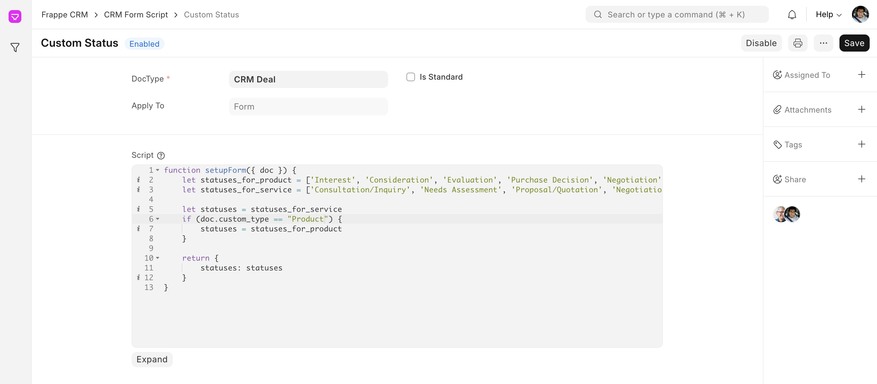 - The setupForm function receives the current Lead/Deal document (doc) as input.