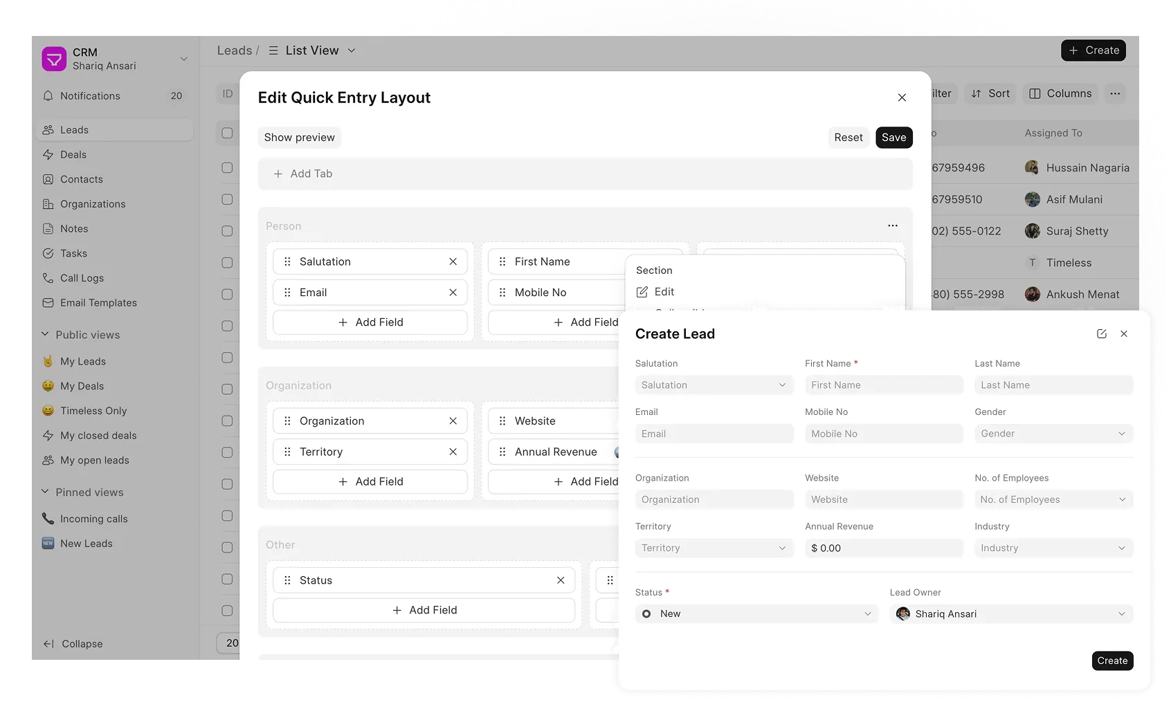 Add new leads fast with customizatble Quick Entry Layout