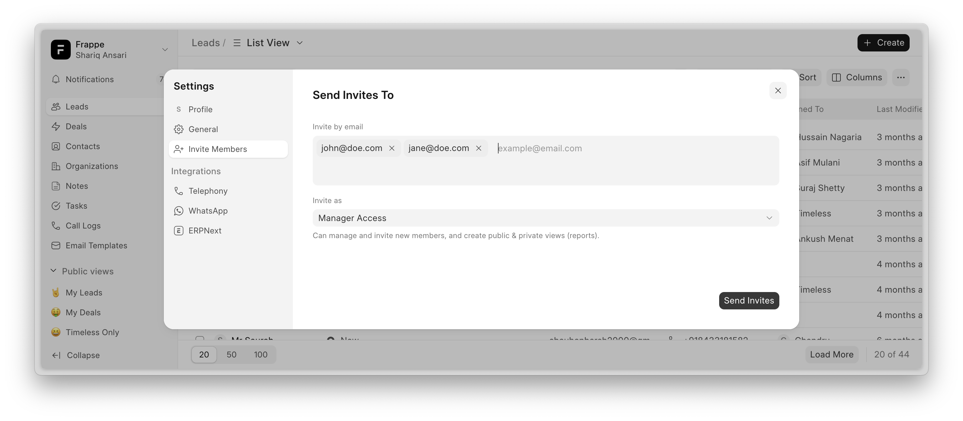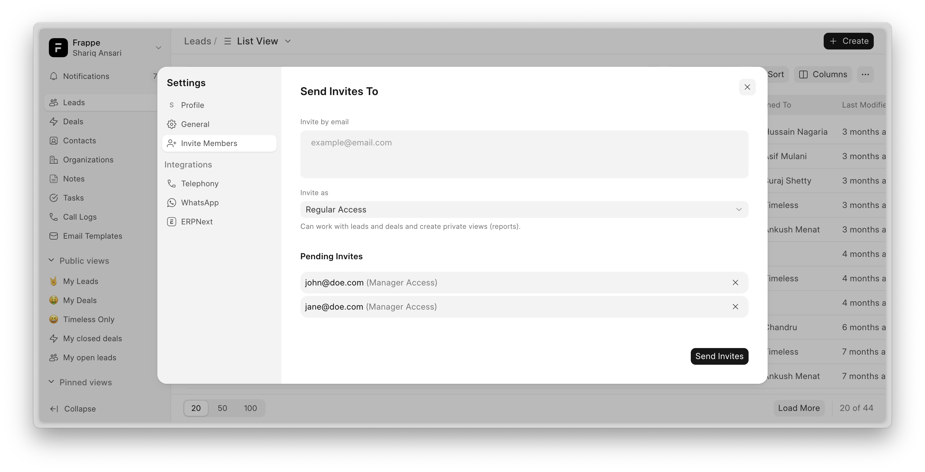 The Invite Members feature allows you to invite agents via email and assign them either Manager Access or Regular Access based on their role.