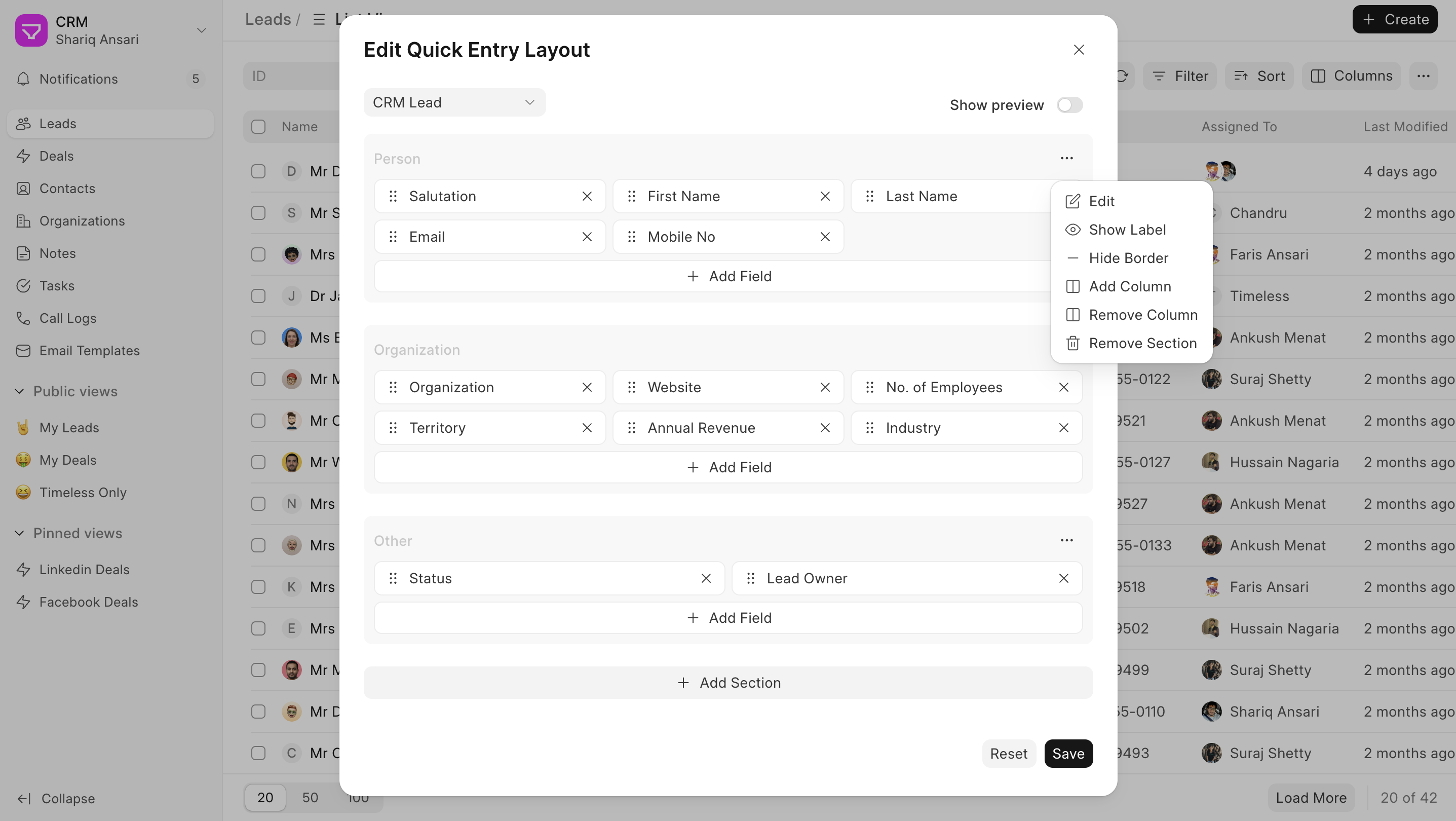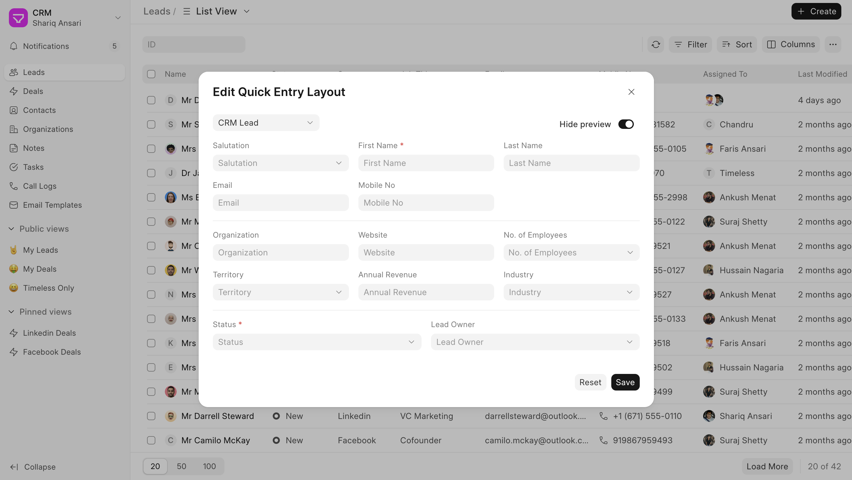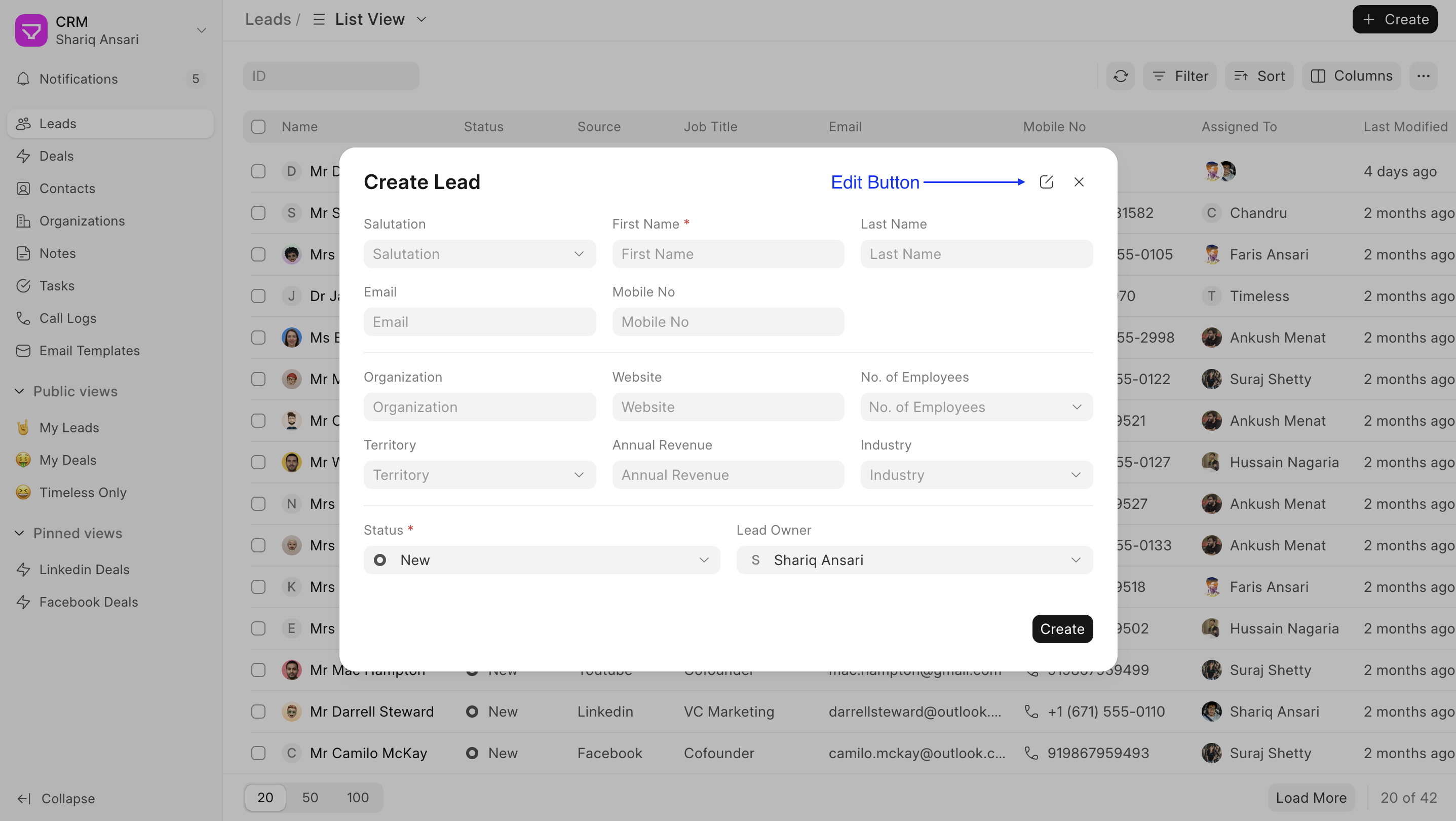 - Navigate to Lead/Deal ListView: Go to Lead/Deal ListView and click on the "Create" to open quick entry modal. Click on the edit button.