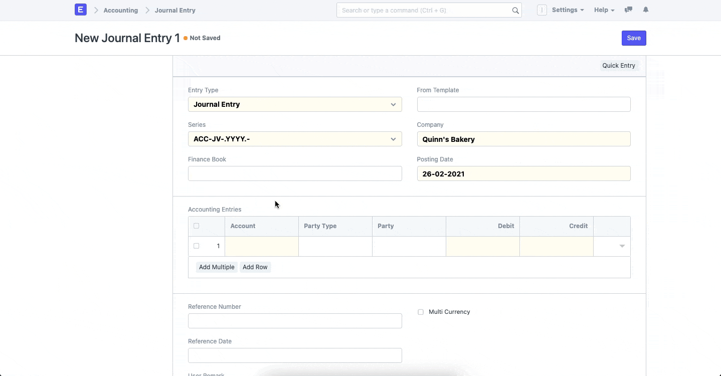To link a Journal Entry to the document* of choice, expand the row you want to insert a reference with and choose the Reference Type and Reference Name.