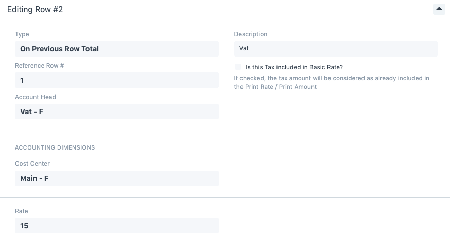 3. Then add a new row and select type of tax as On Previous Row Total and select or add new tax as VAT and set rate at 15%.