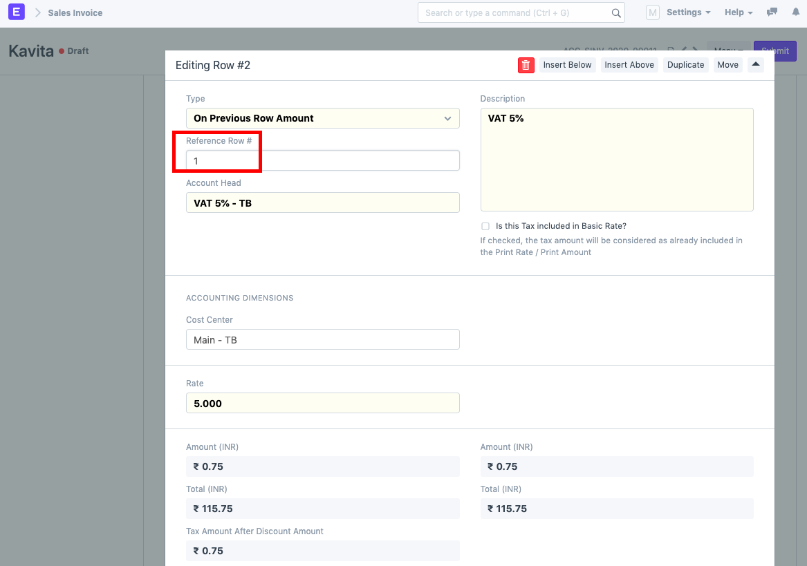 - Next, you need to calculate tax on the previous row's amount (which is the tax amount). To do this, select the Type as "On Previous Row Amount". Set the Account Head and Rate as needed. Expand the row and set the Reference Row # as shown below.