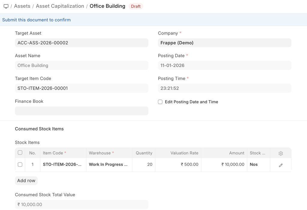 On submission of an asset, "Capital Work in Progress" account will be credited and the asset account related to the asset will be debited. Submission is only possible after entering "Available-to-use Date". If "Available-to-use Date" is a future date, then accounting entry will be booked automatically on that date via the scheduler.