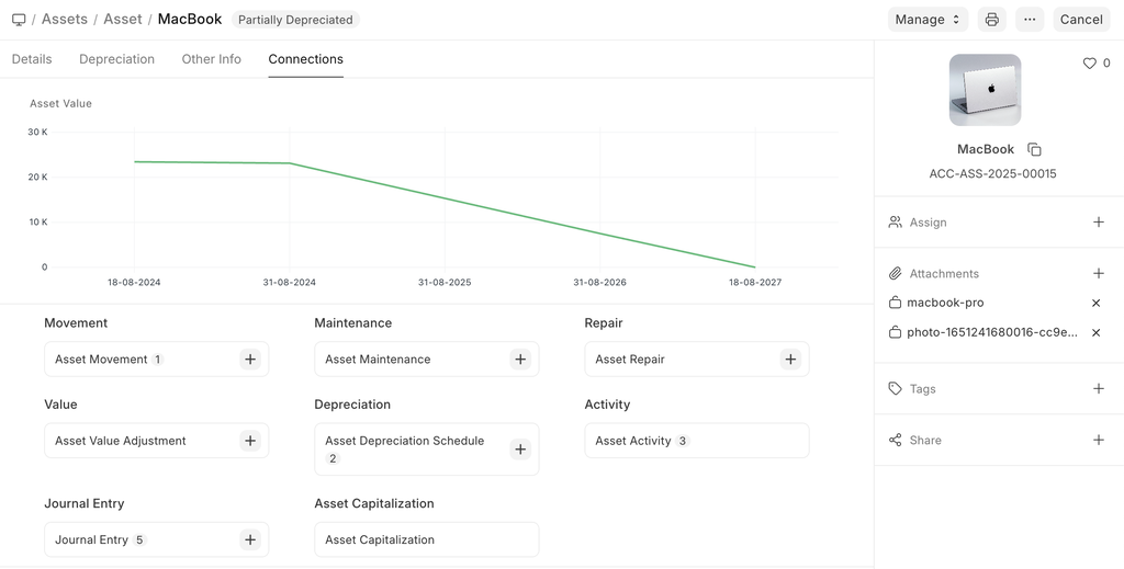 In Mjara ERP, the Asset record is the heart of asset management module. All the transactions related to an Asset like purchasing, depreciation, maintenance, movement, scrapping, sales will be recorded against the Asset record.
