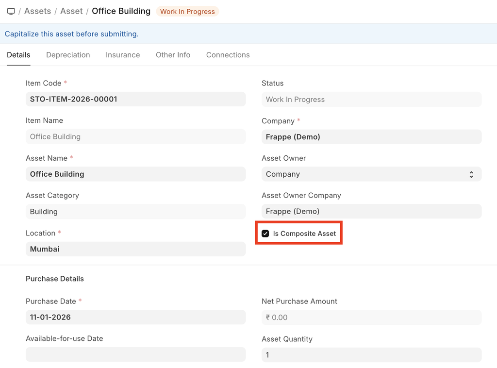 If, for example, you want to create a "Computer" asset made from multiple different items like "Monitor", "Keyboard", etc., you can create a composite WIP asset by checking the is_composite_asset checkbox. Afterwards, you can tag that asset in the WIP Composite Asset field of the Item in Purchase Receipts/Invoices, and once all the items are available, you can use the Asset Capitalization feature to capitalize the asset.