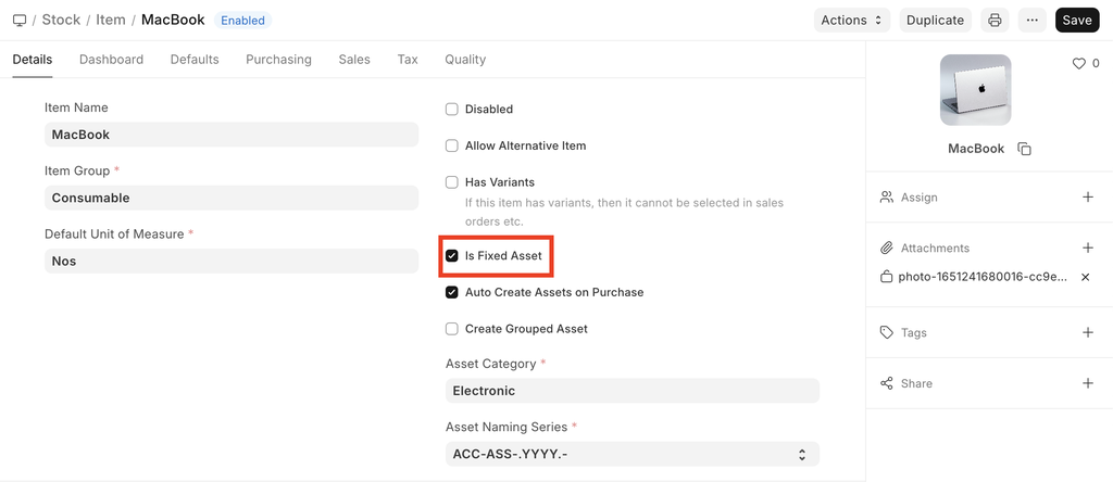 - Item with 'Is Fixed Asset' enabled.