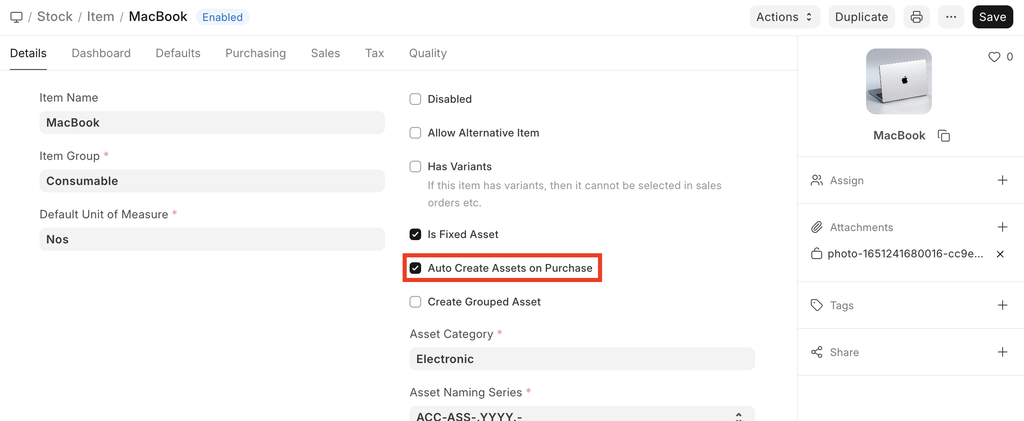 You can configure Mjara ERP to automatically create assets on submission of Purchase Receipt by enabling 'Auto Create Assets on Purchase' in Item.