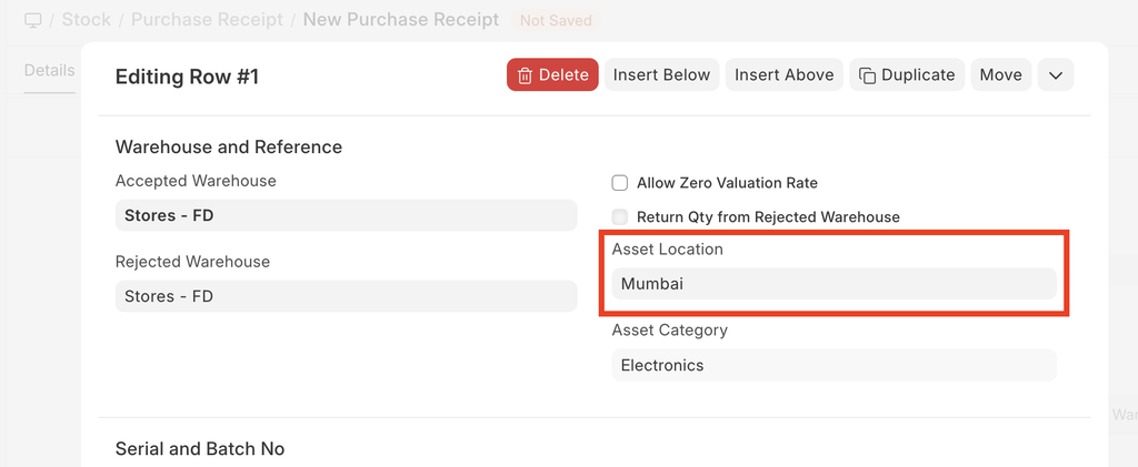 - Select the Item Code. Item Name and Asset Category will be fetched automatically.
