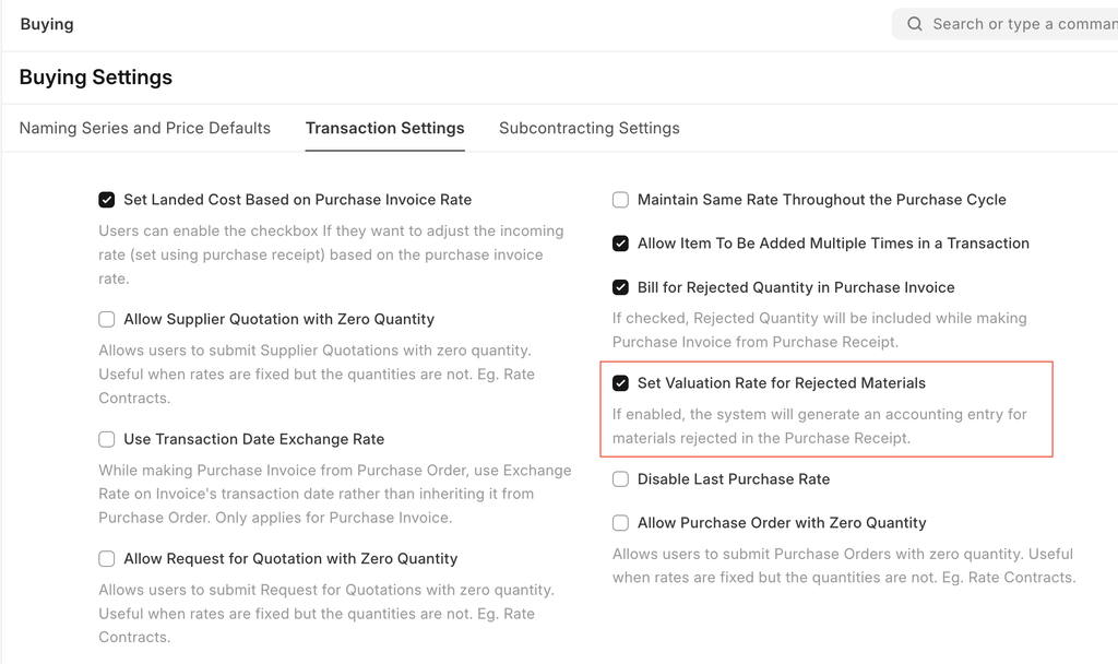 For rejected materials, the valuation rate is set to zero, and no accounting ledger entry is created for them in the Purchase Receipt. To apply a valuation rate and generate accounting entries for rejected materials, enable the 'Set Valuation Rate for Rejected Materials' option in Buying Settings. This option is only applicable when Bill for Rejected Quantity in Purchase Invoice has enabled in the Buying Settings.
