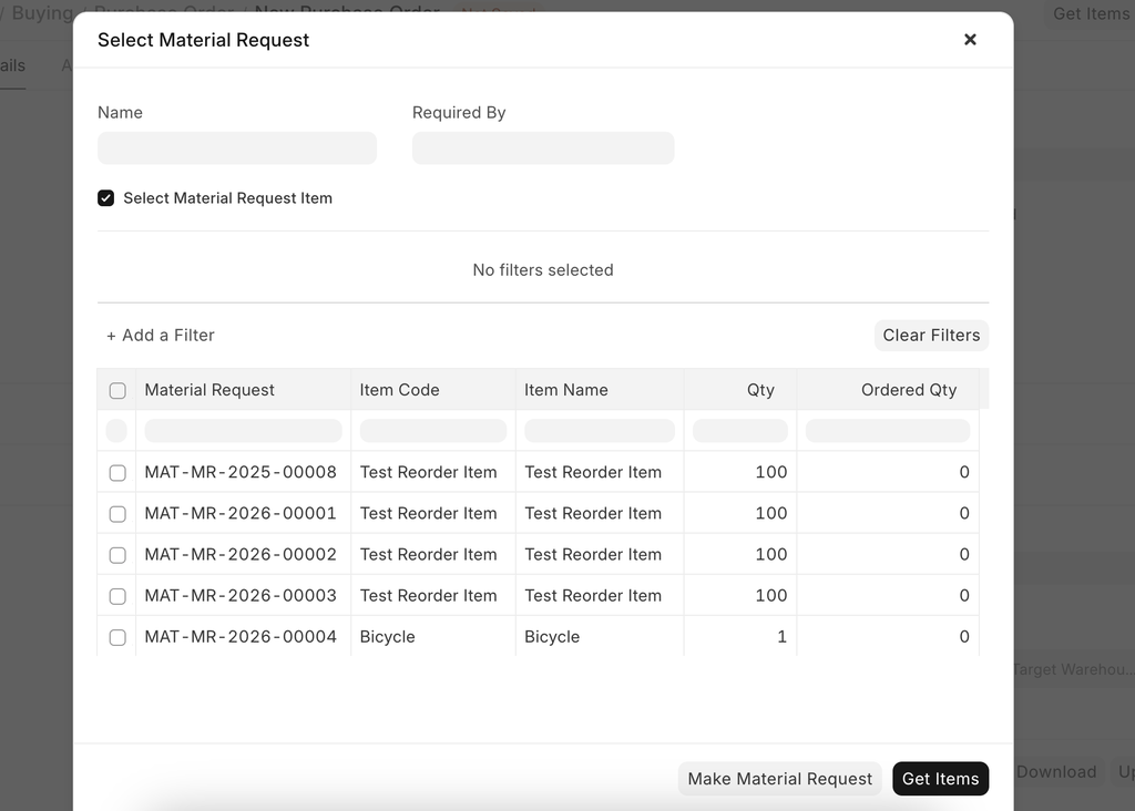 Items can be fetched into the Purchase Order automatically from open Material Requests. For this to work, the following steps need to be done: