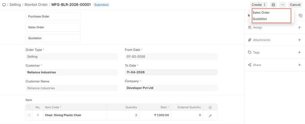 Once a Blanket Order is submitted, you can create new Quotations by clicking on Quotation under the Create button.