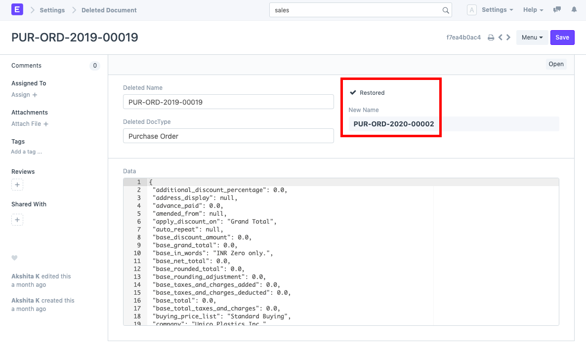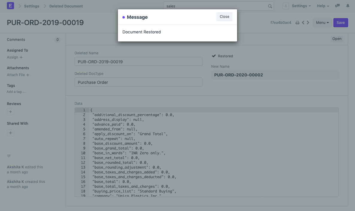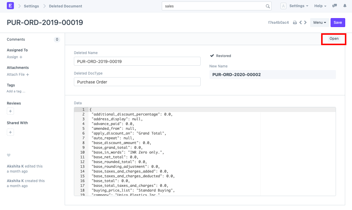 - You can directly open the newly restored document through the "Open" button or search for the same in that document's list (in this case, Purchase Order list).
