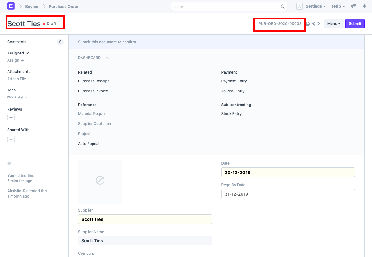 - Once the Restore button is clicked, the document gets restored in Draft State with a New Name according to the Naming Series.