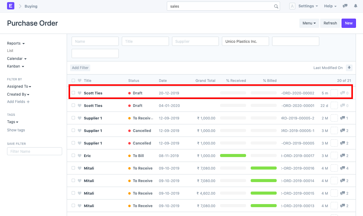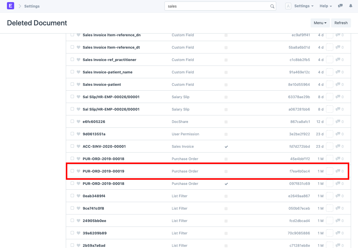 - Search for the deleted document. You can also filter out the document based on the Deleted DocType. For example we need to restore the Purchase Order, PUR-ORD-2019-00019. To do so, search for the same in the deleted document list and open it.