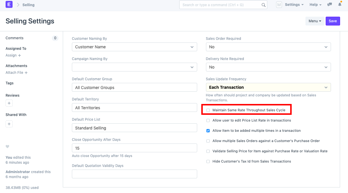 - Go to Selling Settings and make sure the "Maintain Same Rate Throughout Sales Cycle" checkbox is unchecked. This setting will allow you to have different rates for the same items in different Sales transactions (Sales Order, Delivery Note, Sales Invoice, etc.).