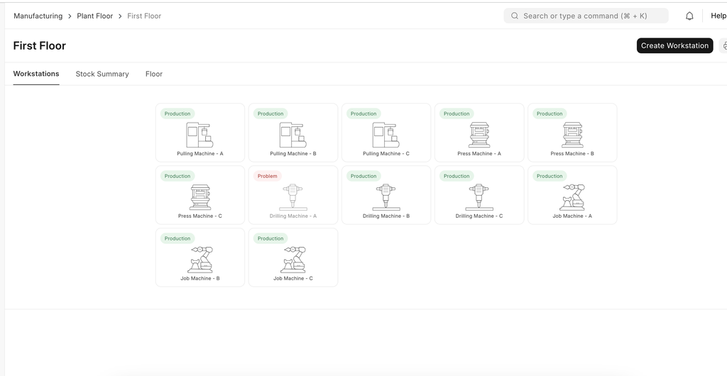 After that you can see the status of machines and workstations using plant floor.