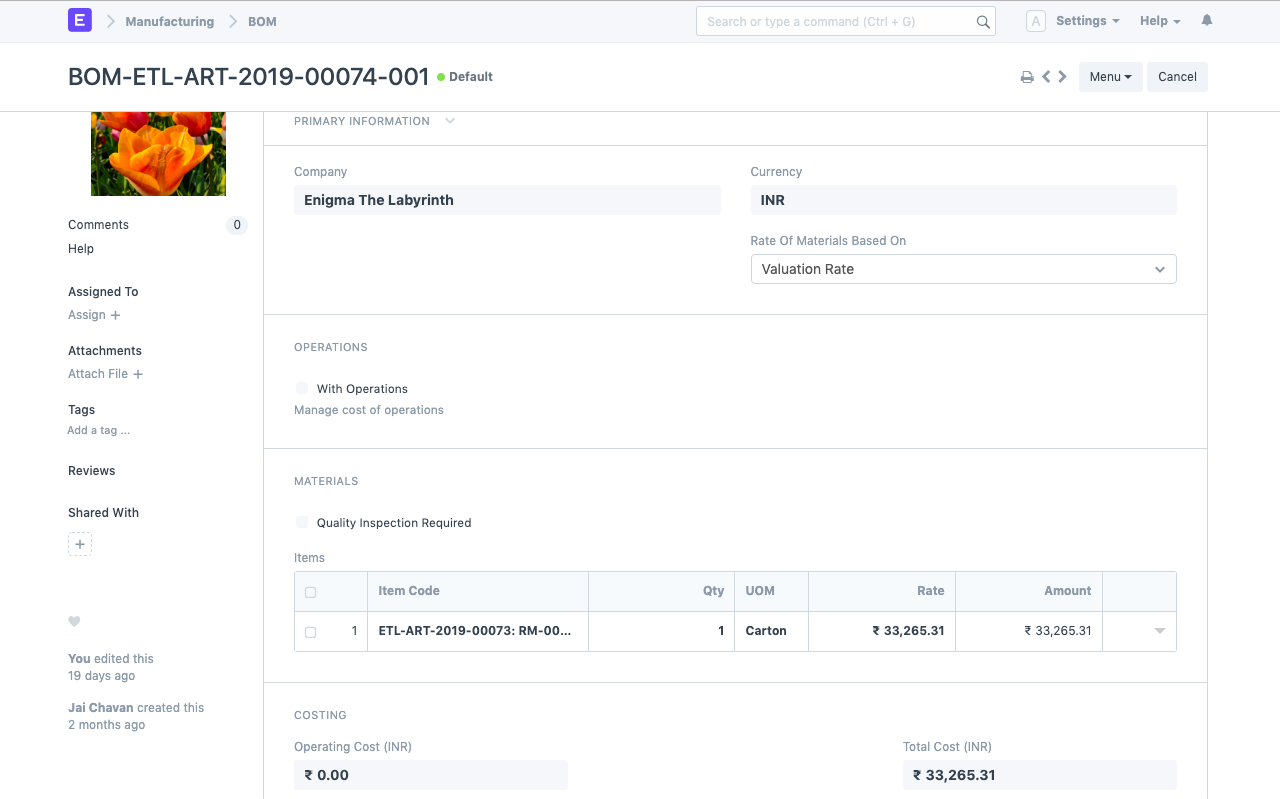 - Create a BOM (Bill of Material) for the subcontracted Item and include the raw materials that you send to the subcontractor so as to get the finished/semi-finished product. There will be no operations in this BOM since the activities are not done at manufacturer's end. In our example, the BOM of RM-111-Colored-Flower is as below: