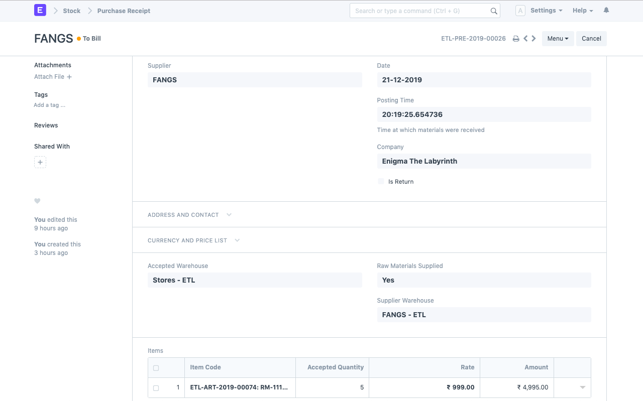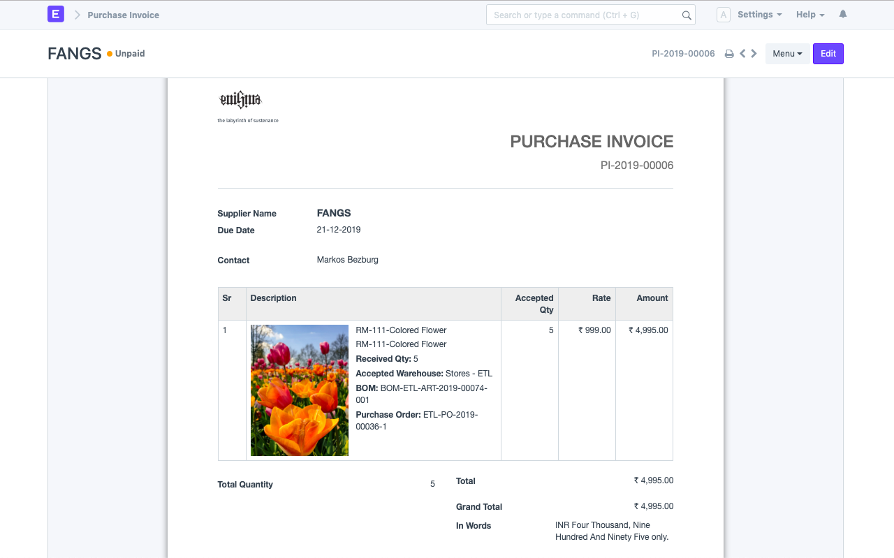 - Purchase Invoice created for this transaction: (Print Format Preview)