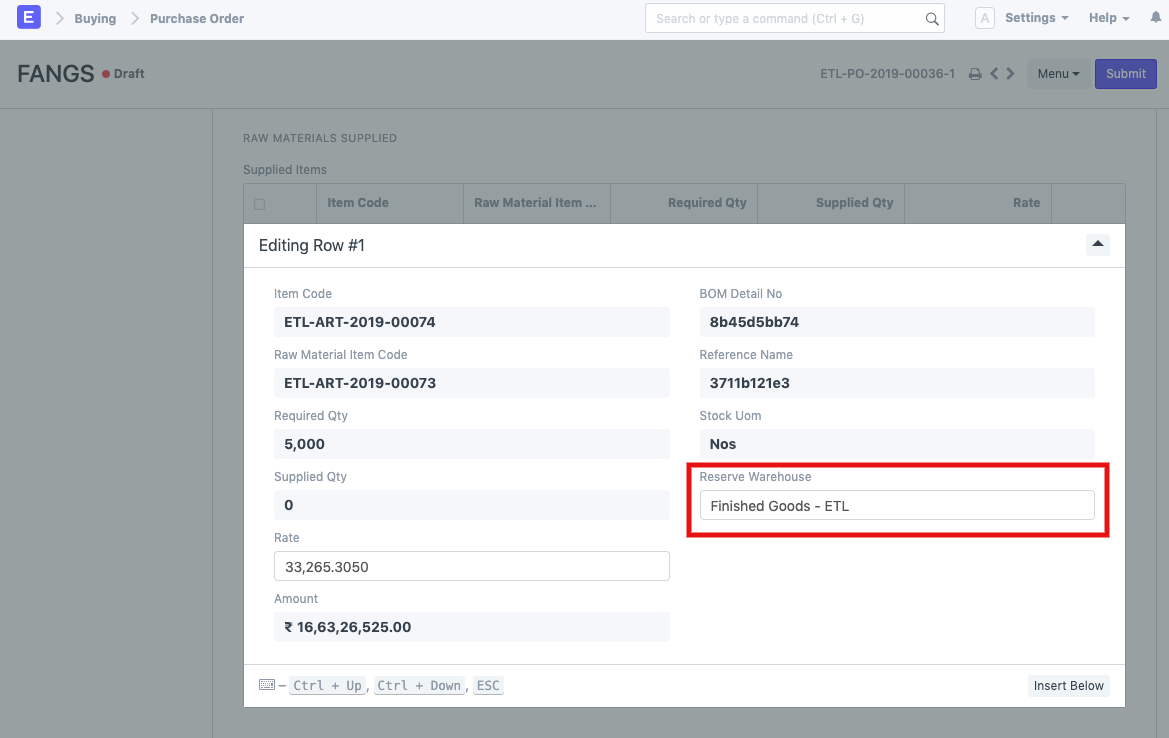 - There is also another child table that shows the status of the raw materials to be transferred against this Purchase Order. In that table, you need to select the "Reserve Warehouse" from which the raw materials will be transferred to the virtual vendor warehouse that we selected in previous step. This table also tells you how many items have been supplied already, in our case, it is zero since we are yet to submit the order and supply the raw materials.