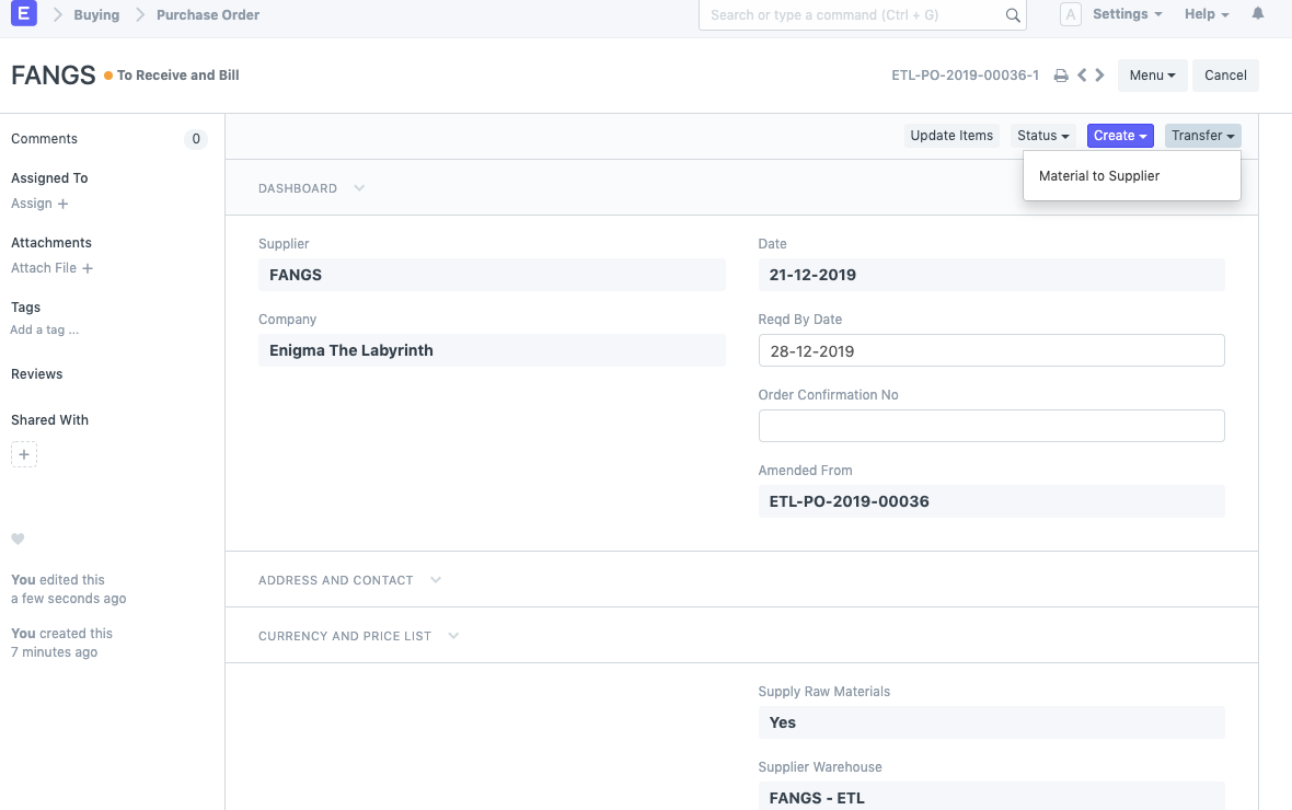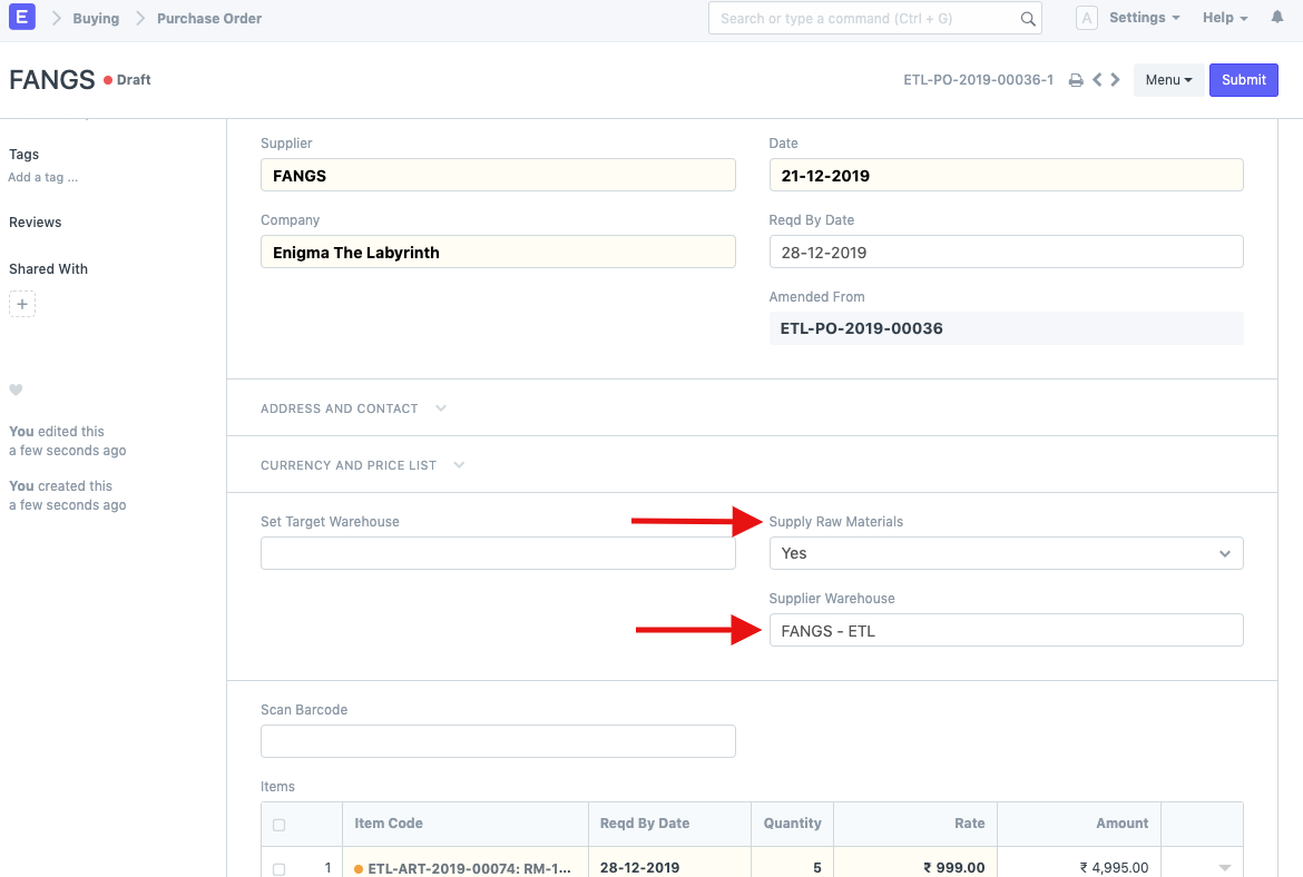 - Now, you need to create the Purchase Order for procuring this Item from the external party/vendor. Ensure that you select "Yes" for the field, "Supply Raw Materials" and then select the warehouse from which the raw materials will be transferred to the vendor. Note that this can also be a virtual warehouse just to stand as a placeholder for making the Stock Entry when transferring materials to the vendor. Below is the Purchase Order as per our example: