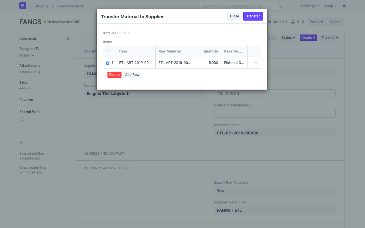 - After submission of the Purchase Order, there will be a button, "Transfer" for creating the Stock Entry to transfer raw materials to the external vendor: