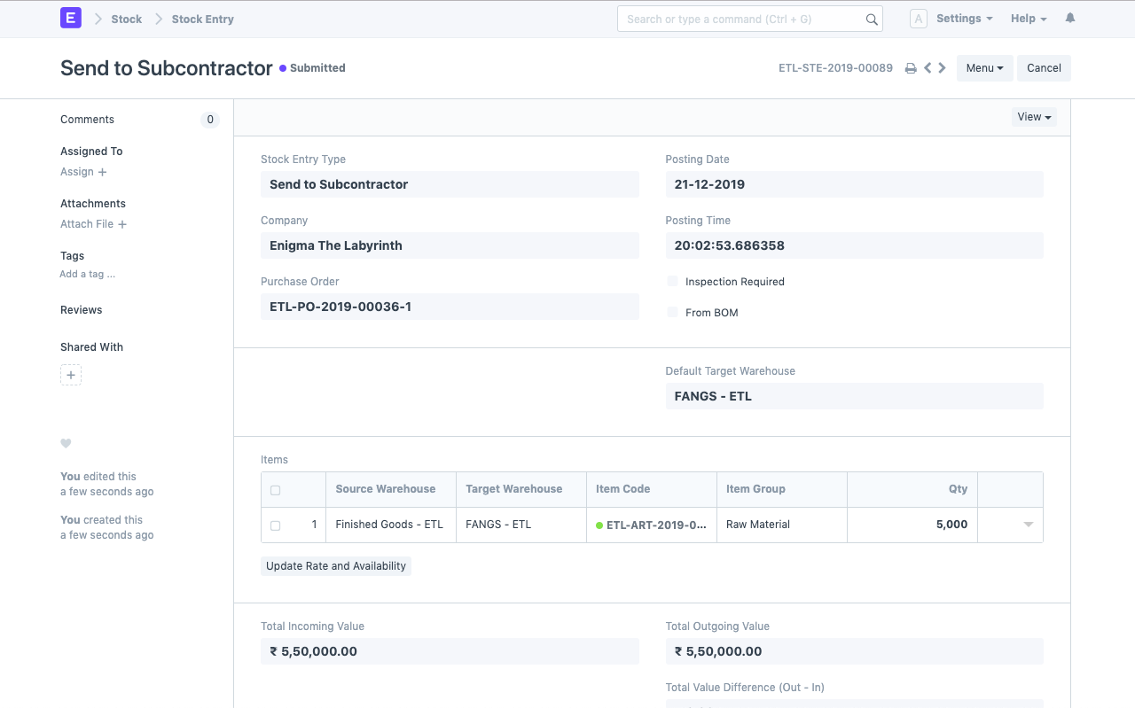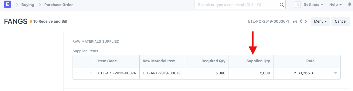 Once the Stock Entry is submitted, the child table in the Purchase Order is also updated to reflect the transferred quantity under "Supplied Qty"