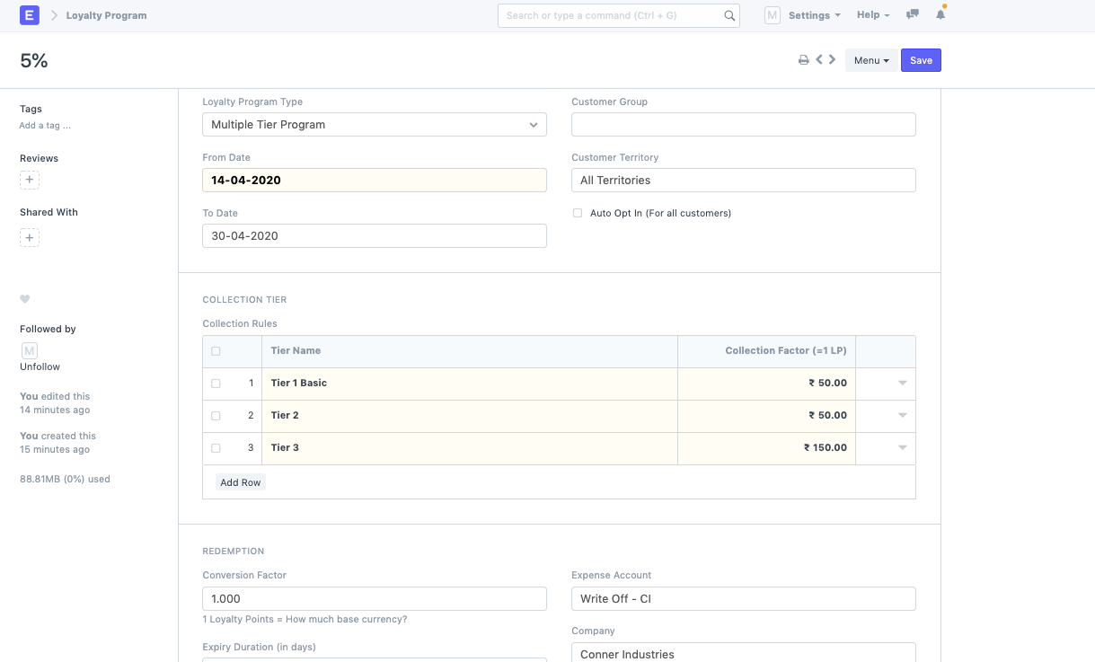 - Create a Loyalty program in the doctype: You can set Single Tier or a Multiple Tier Program based on the slabs existing in the amount of Purchase that is done in Mjara ERP.