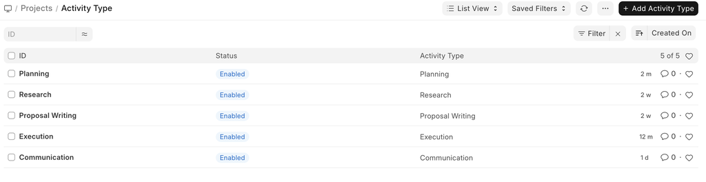 By default, the following Activity Types are created in Mjara ERP.