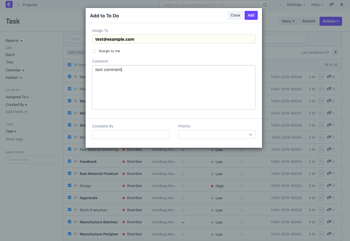 You can also enter other details such as Comments, Completed By and bulk set the Priority of the Tasks. - Click on Add. Note: You can follow the above steps to bulk assign any documents in Mjara ERP. Last updated 3 weeks agoWas this helpful?