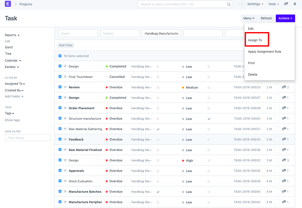 - Go to Actions > "Assign To" and select the User to whom you wish to assign these Tasks.