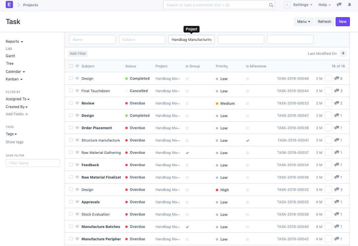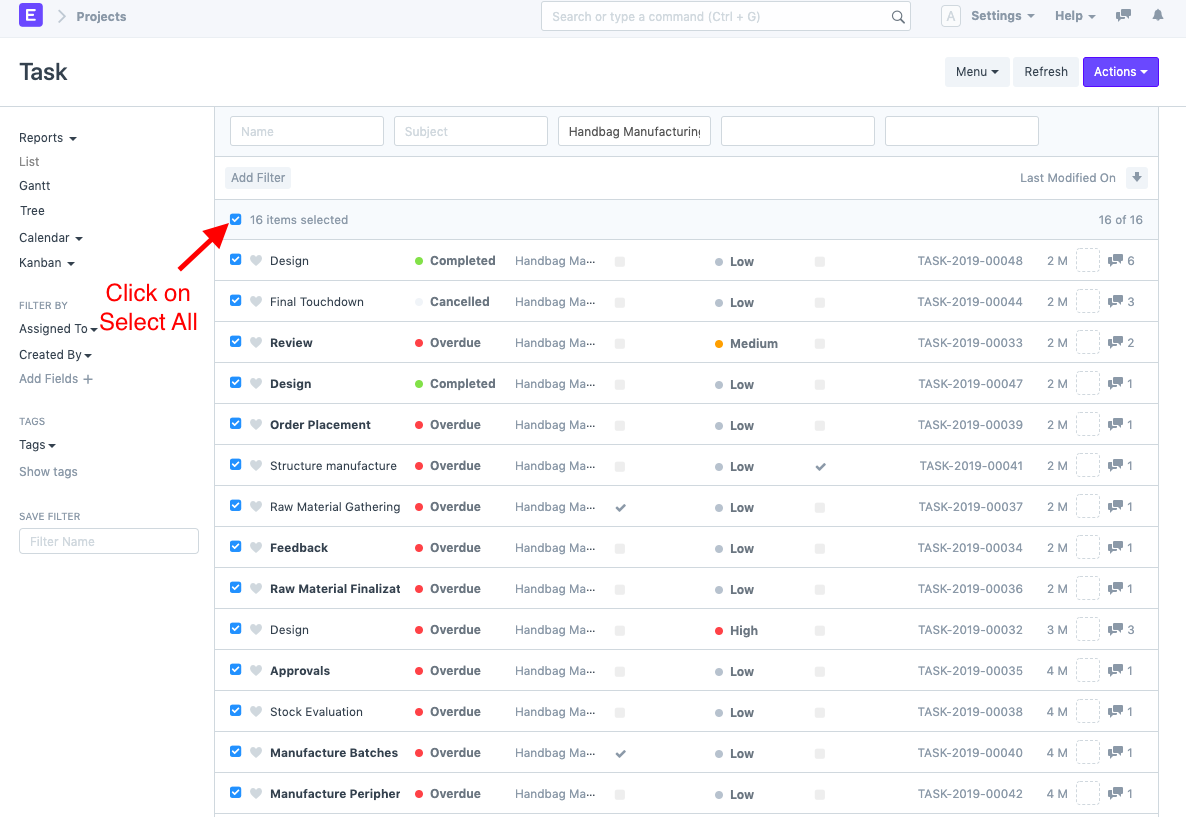 - Go to Task List and filter the Tasks based on the Project as shown below: