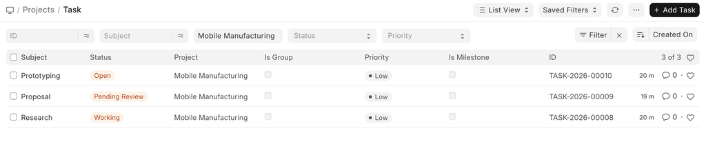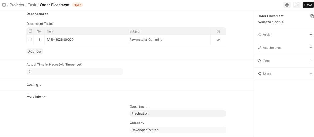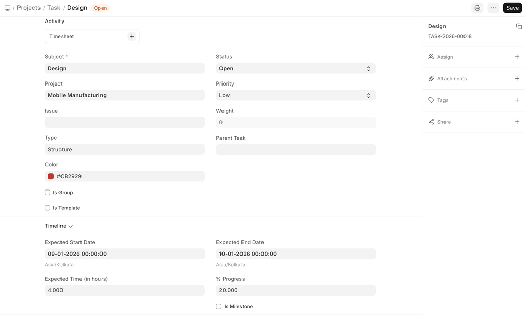 - Actual End Date: The actual date and time on which the task was finished get recorded here via the Timesheets.