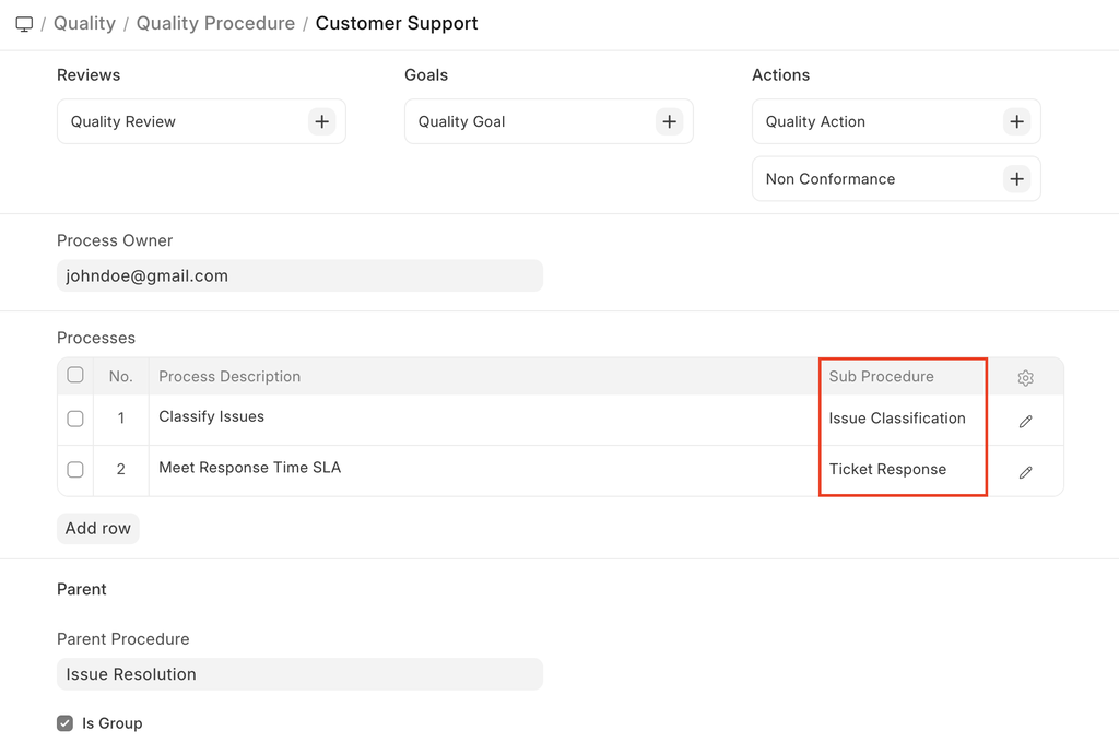 Process can either be just a instruction or a different Quality Procedure. You can link a Quality Procedure as a sub-procedure to another one: