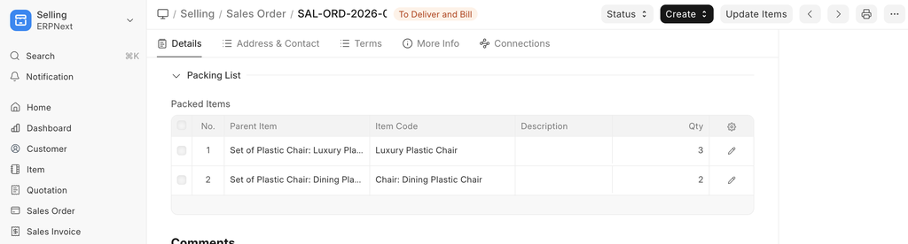 The “Packing List” table will be automatically updated when you “Save” the Sales Order. If any Items in your table are Product Bundle (packets), then the “Packing List” will contain the exploded (detailed) list of your Items.