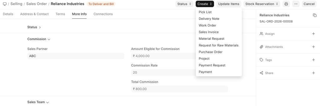 - Project: If your Sales Order is part of a project, you can link it here and the Project progress will be updated.