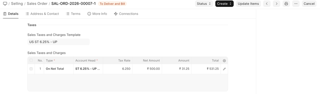 To add taxes to your Sales Order, you can select a Sales Taxes and Charges Template or add the taxes manually in the Sales Taxes and Charges table.