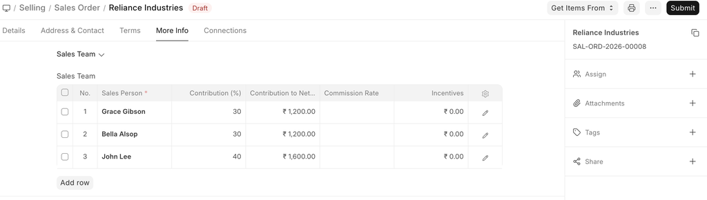 Sales Persons: Mjara ERP allows you to add multiple Sales Persons who may have worked on this deal. You can change the contribution percentage of the Sales Persons and track how much incentives they earned on this deal.