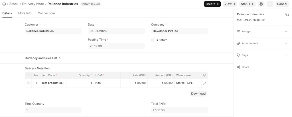 - Then click on 'Create > Sales Return', it will open a new Delivery Note with 'Is Return' checked, Items, Rate, and taxes will negative numbers. Return Against Delivery Note