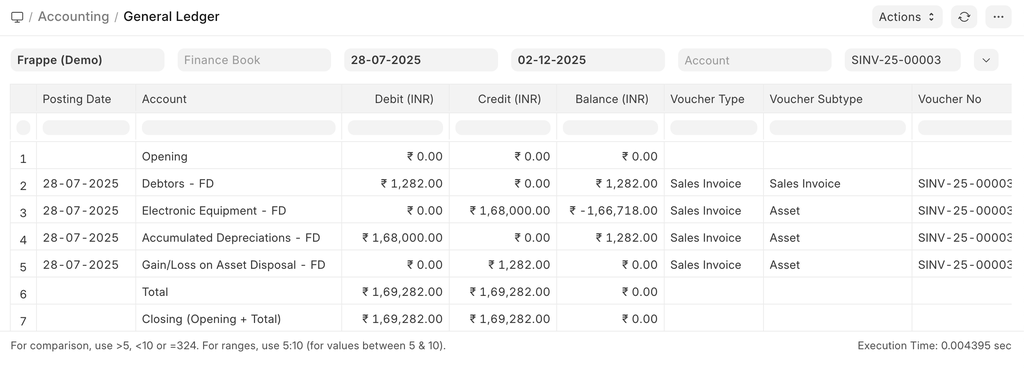 - "Gain/Loss Account on Asset Disposal" will be credited/debited based on gain/loss amount. The Gain/Loss account can be set in Company record.