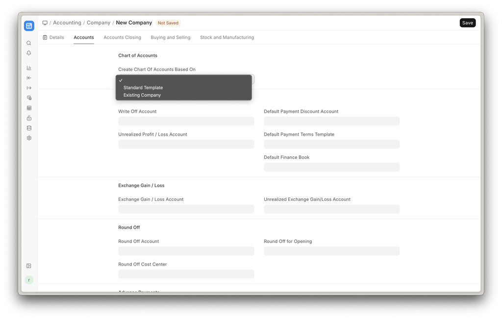 Within the Company master, you can set many of the default values for masters and accounts. These default accounts will help you in the quick posting of accounting transactions, where the value for the account will be fetched from the Company master if provided. As soon as the company is created, a default Chart Of Accounts and Cost Center is automatically created.