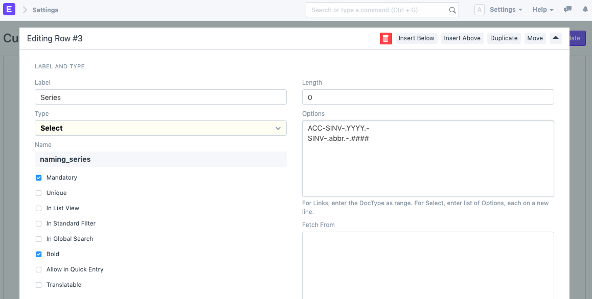 - Now, in the Customize Form itself, go to the Naming Series row and expand it. In the Options box, add another entry in new line (taking Sales Invoice as example)