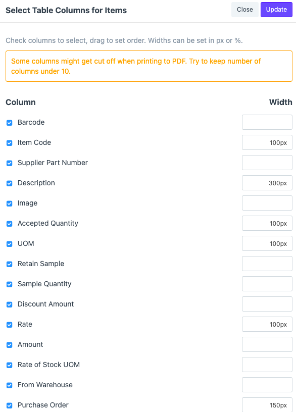 Select the columns you want to keep in the Table that you are creating for your customized Print Format. You can adjust the Width and their order according to your requirement.