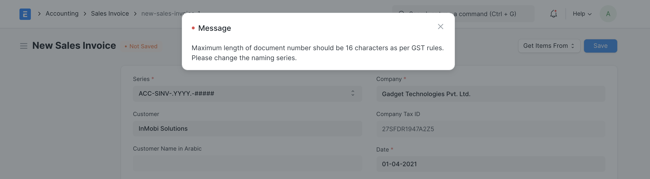 This validation will come into effect in Mjara ERP from the new fiscal year i.e FY 2021-22. If you encounter an error similar to one shown in the screenshot below, follow the below steps to resolve the issue and add a new naming series for Sales and Purchase Invoices