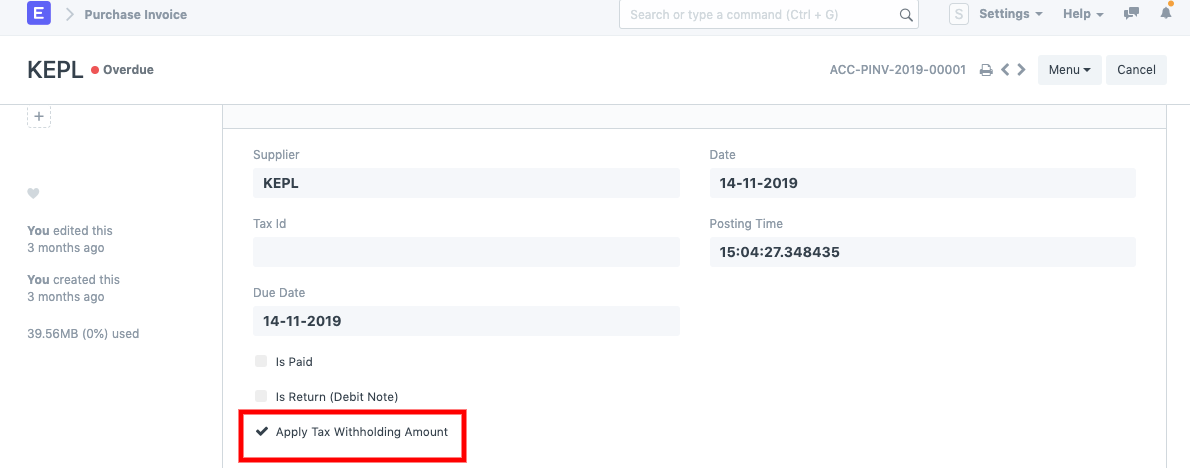- Now when you create a Purchase invoice against that supplier make sure "Apply Tax withholding Amount" is checked then only system will auto fetch TDS Payable amount in "Taxes & Charges" table based on Threshold you have defined.